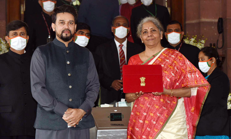 Union Minister for Finance and Corporate Affairs Nirmala Sitharaman along with the Minister of State for Finance and Corporate Affairs Anurag Singh Thakur arrives at Parliament House to present the General Budget 2021-22, in New Delhi on February 1, 2021.