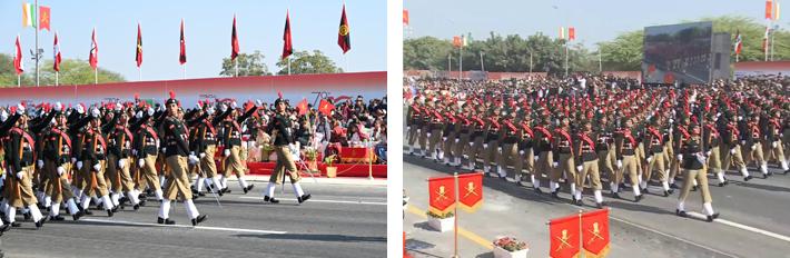 The parade featured over 30 entities participating in an impressive march-past with seven distinguished marching contingents, representing various Regimental Centers, including MADRAS Regimental Centre, RAJPUT Regimental Centre, Regiment of Artillery, Mixed Scouts Contingent and a NCC Girls Contingent. In a remarkable first, two special contingents participated in the parade, the Bhairav Battalion Contingents from RAJRIF and SIKH LI, symbolising the Indian Army's strategic shift towards modern, agile and lethal warfare capabilities, specifically designed for rapid, high-impact operations along its borders. These contingents reflected Bhairav Battalions as a "lean and mean" force representing lndia's resolve to "fight smarter and strike faster" in the modern battlefield. A fly-past by Army helicopters such as LCH, ALH, WSI and APACHE aircrafts further enhanced the grandeur of the parade.