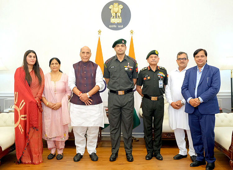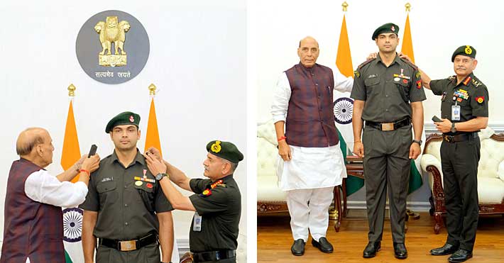 Defence Minister Rajnath Singh formally conferred the gleaming insignia of Honorary rank of Lieutenant Colonel in the Territorial Army upon star javelin thrower and two-time Olympic medalist Neeraj Chopra during the pipping ceremony in South Block, New Delhi on October 22, 2025. Interacting with Lt Colonel (Hony) Neeraj Chopra and his family members, Defence Minister described him as an epitome of perseverance, patriotism and the Indian spirit of striving for excellence.